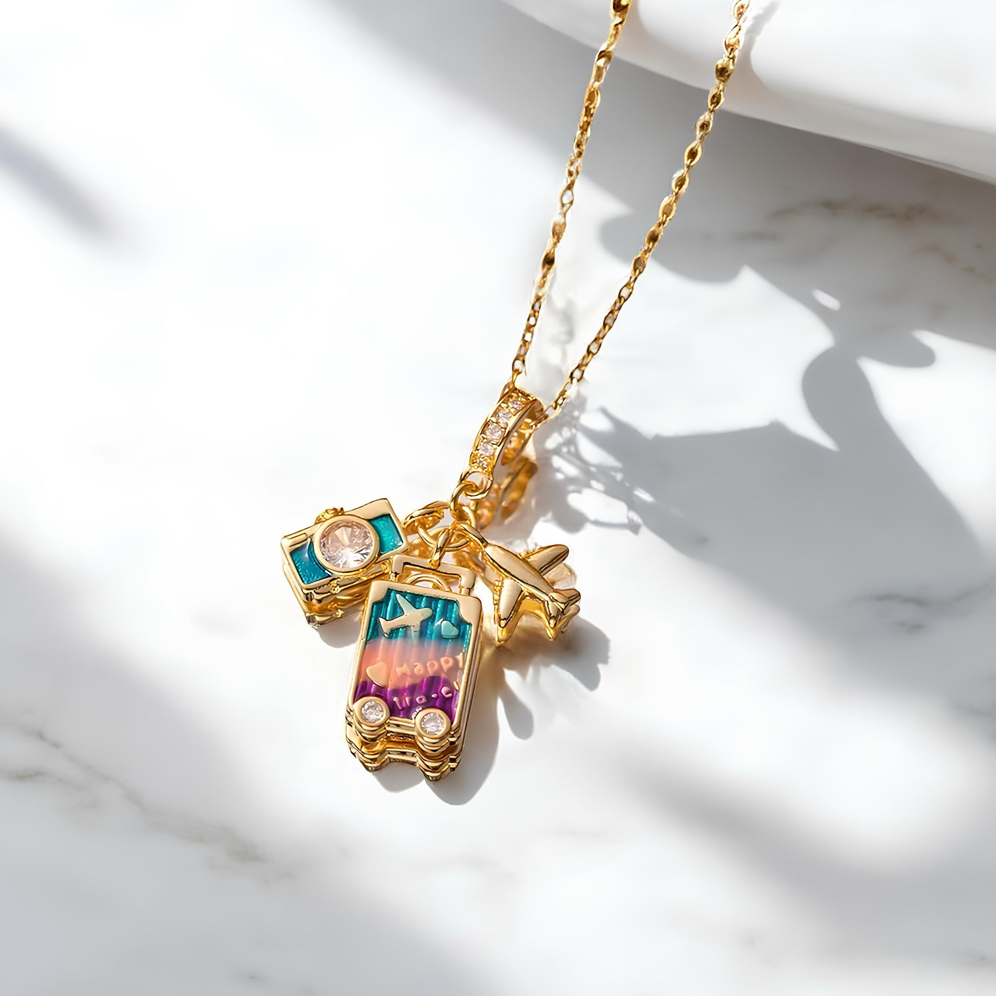 Le Collier Voyage Doré symbolise la liberté et l’évasion. Son pendentif unique réunit trois charms : une valise colorée, un avion et un appareil photo — tout ce qu’il faut pour les esprits curieux et aventuriers.